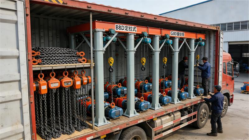 Recently, the production workshop of Hebei Tieshou Lifting Machinery Manufacturing Co., Ltd. has been bustling with activity. Multiple batches of containers loaded with core products such as BZD fixed-column jib cranes, G80 hoisting chains, electric hoists, and hand chain hoists have been loaded and successfully shipped. These devices will be sent to cooperative customers in the Middle East and Europe, including Saudi Arabia, the United Arab Emirates, and Germany, providing efficient hoisting solutions for production operations in local manufacturing, logistics and warehousing, engineering construction and other fields.