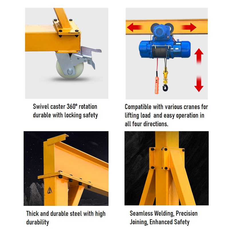 This heavy-duty detachable mobile gantry crane is constructed from high-strength I-beams for superior stability. It features 360° swivel casters with reliable braking systems for easy maneuverability and secure locking. With a load capacity ranging from 1 to 5 tons (custom sizes can be provided upon request), it is specifically designed to work with various hoists for safe and efficient load handling, lifting, and transportation in diverse industrial settings.