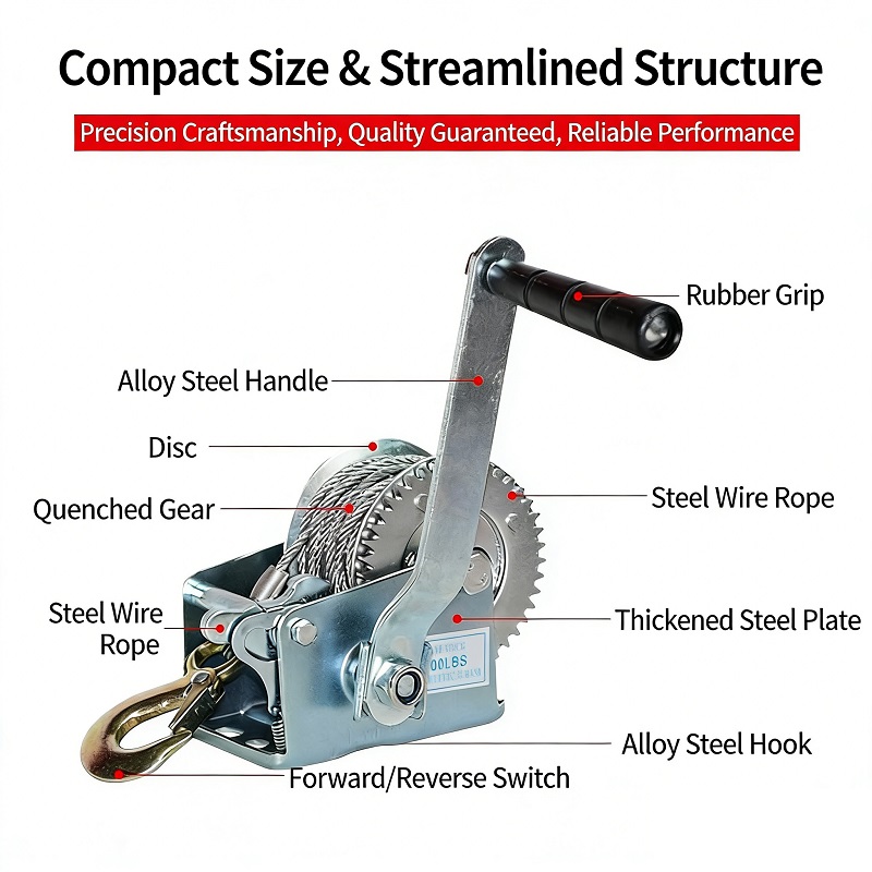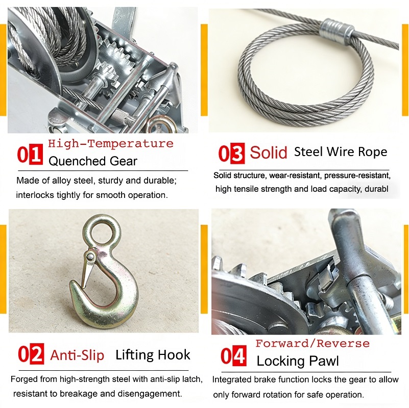 Built with durability and safety at its core, our hand winch features a precision-engineered gear train and a self-locking pawl system to prevent reverse movement, ensuring loads stay securely in place. The winch is constructed from premium alloy steel and galvanized components to resist corrosion, making it suitable for both indoor and outdoor use. Its ergonomic crank handle provides comfortable leverage, while the heavy-duty hook and steel cable work together to handle demanding pulling tasks.