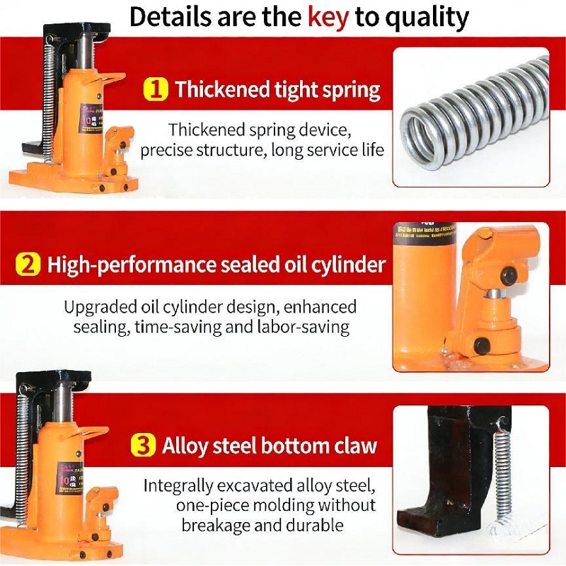 Built with premium materials and precision engineering, our hydraulic toe jack combines robust performance with durable construction. It integrates a thickened high-tension spring, a one-piece forged alloy steel toe, and a high-performance sealed hydraulic cylinder to ensure reliable lifting. The ergonomic handle and compact design enable easy portability, while the hardened steel top cap and wear-resistant inner spindle guarantee long-term durability. Suitable for workshops, construction sites, and vehicle maintenance facilities, it provides consistent lifting performance for loads up to 20 tons.