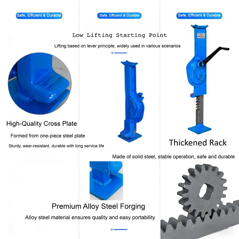 安全性、効率性、耐久性を基本理念として設計されたハンドクランク式ラックジャックは、プレミアムな素材と精密なエンジニアリングを統合しています。高級合金鋼から鍛造され、滑らかな操作を可能にする増厚ラック&ギアシステム、偶発的な落下を防止する自動ローディングブレーキ、持ち運びが容易な人間工学に基づいた折りたたみハンドルを備えています。レールのメンテナンス、機器の設置、自動車修理など、要求の厳しい環境でも安定したリフト力と長い耐用年数を提供します。