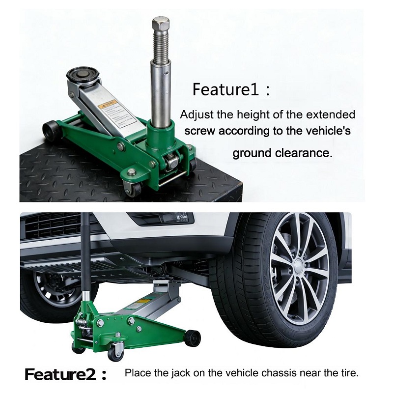 2.안전한 배치:차량의 타이어 장착 지점 근처의 평평하고 안정적인 표면에 잭을 배치합니다.