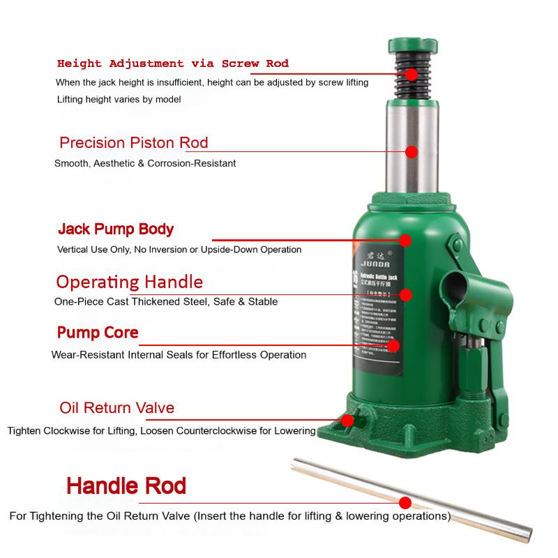 4.제어된 하강:사용 후 오일 리턴 밸브를 시계 반대 방향으로 1-2회전하고 잭이 중력을 받고 내려오도록 하십시오 (오일이 새지 않도록 너무 느슨해지는 것은 피하십시오).