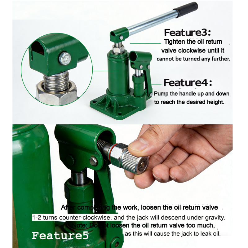 3.차량 들어올리기:오일 반환 밸브를 시계 방향으로 조인 다음 핸들을 위아래로 펌프질하여 원하는 높이에 도달합니다.