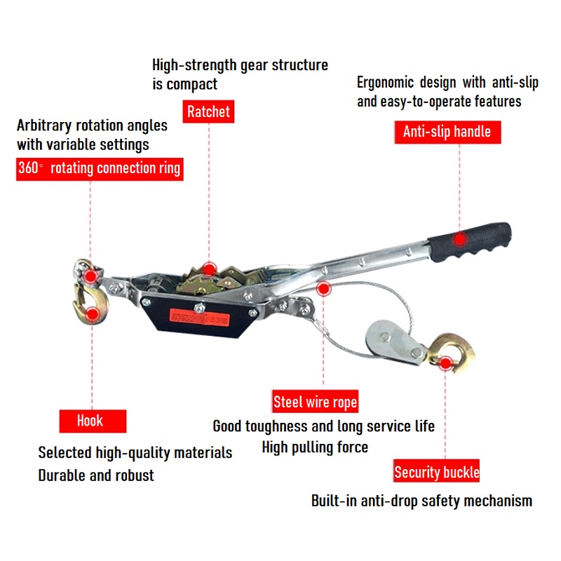 유연한 포지셔닝을 위한 360° 회전 연결 링, 안전을 위한 반전 방지 라쳇 메커니즘, 하중 하에서 장력을 유지하는 자동 제동 시스템이 특징입니다.이 공구는 1톤, 2톤, 4톤 부하 용량으로 사용할 수 있어 전력선 설치 및 화물 확보부터 농업 및 건설 현장 작업에 이르기까지 작업에 적합합니다.