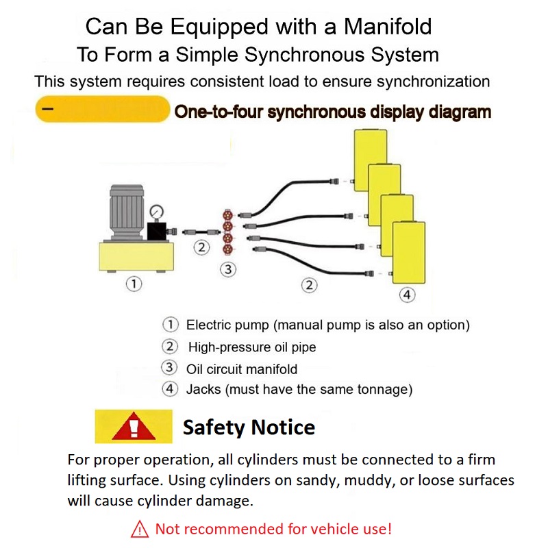 Một đa tạp mạch dầu tùy chọn cho phép thiết lập nâng đồng bộ 1-4, trong đó nhiều thanh kéo hoạt động song song. Hệ thống này đòi hỏi phân phối tải thống nhất để duy trì đồng bộ hóa, làm cho nó lý tưởng để nâng các cấu trúc lớn, cân bằng như phân đoạn cầu hoặc máy móc hạng nặng.