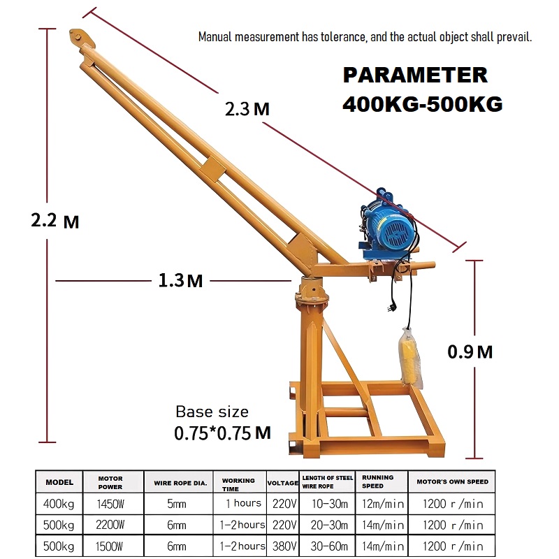 Được thiết kế cho độ tin cậy và tính linh hoạt, khung ngoài trời này có một khung chắc chắn được xây dựng từ thép tiêu chuẩn quốc gia dày, đảm bảo độ bền đáng kể và sức đề kháng để biến dạng. Thiết kế mô-đun của nó cho phép lắp ráp nhanh và tháo rời, trong khi sự bùng nổ quay 360 ° cung cấp vị trí chính xác của tải. Mỗi mô hình được kết hợp với một động cơ hiệu quả cao (từ 510W đến 3000W) cung cấp năng lượng nâng phù hợp, tiếng ồn thấp và thời gian phục vụ kéo dài. Với độ cao nâng điều chỉnh và một cơ sở ổn định, tiết kiệm không gian, nó hoàn toàn phù hợp cho các nhiệm vụ nâng ngoài trời quy mô nhỏ, giảm lao động thủ công và cải thiện hiệu quả công việc.